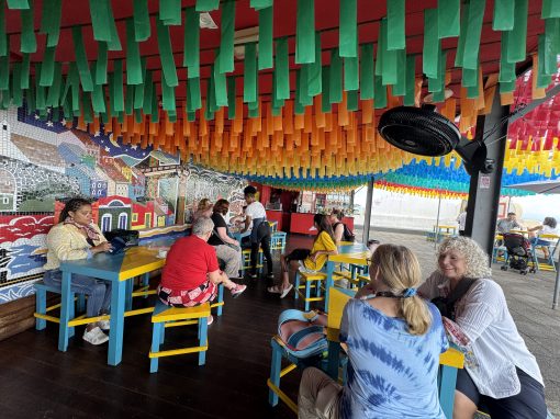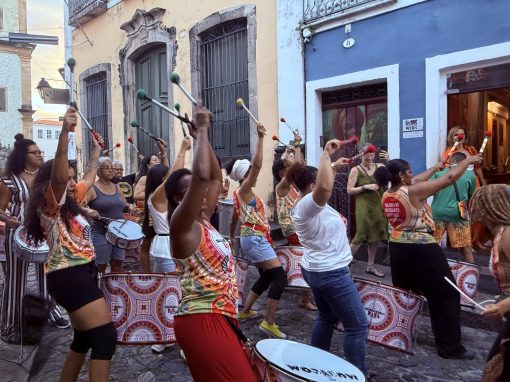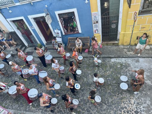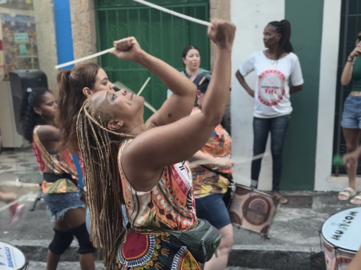 The rest of the day and evening is all things samba reggae, but this time we are actively participating instead of spectating. The wildly talented women and girls of Yayá Muxima led by musician activist Viviam Queiros serve as our teachers. Yayá Muxima exists to empower and amplify the voices of Black women through the power of music. They play a vital role in the community of Salvador da Bahia as they advocate for equity and education of Black women while paying tribute to their ancestors and cultural heritage stemming from the enslavement of African people via the Transatlantic slave trade.
